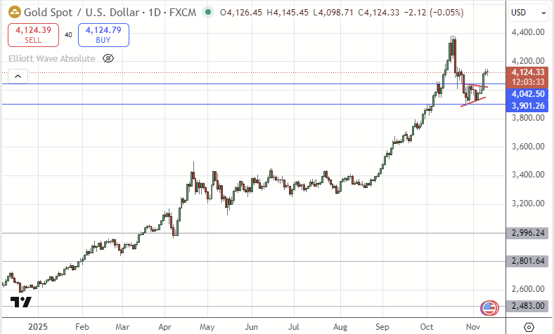 Một điều đáng chú ý nữa là vàng đã lấy lại đà tăng sau khi giảm xuống dưới mốc 3.000 USD/ounce. Giữa kỳ vọng của thị trường về việc Cục Dự trữ Liên bang ( Fed) sẽ cắt giảm lãi suất vào tháng 12 và tiến triển trong việc đóng cửa chính phủ Hoa Kỳ, giá vàng đã tăng lên mức cao nhất trong gần ba tuần.