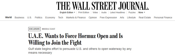 Một quan chức UAE cho biết các nhà ngoại giao đã kêu gọi Hoa Kỳ, cùng với các cường quốc quân sự ở châu Âu và châu Á, thành lập một liên minh để mở cửa eo biển bằng vũ lực; ông nói thêm rằng chế độ Iran coi đây là cuộc chiến sinh tồn và đang cố gắng kéo nền kinh tế toàn cầu xuống bằng cách kiểm soát tuyến đường thủy quan trọng này.